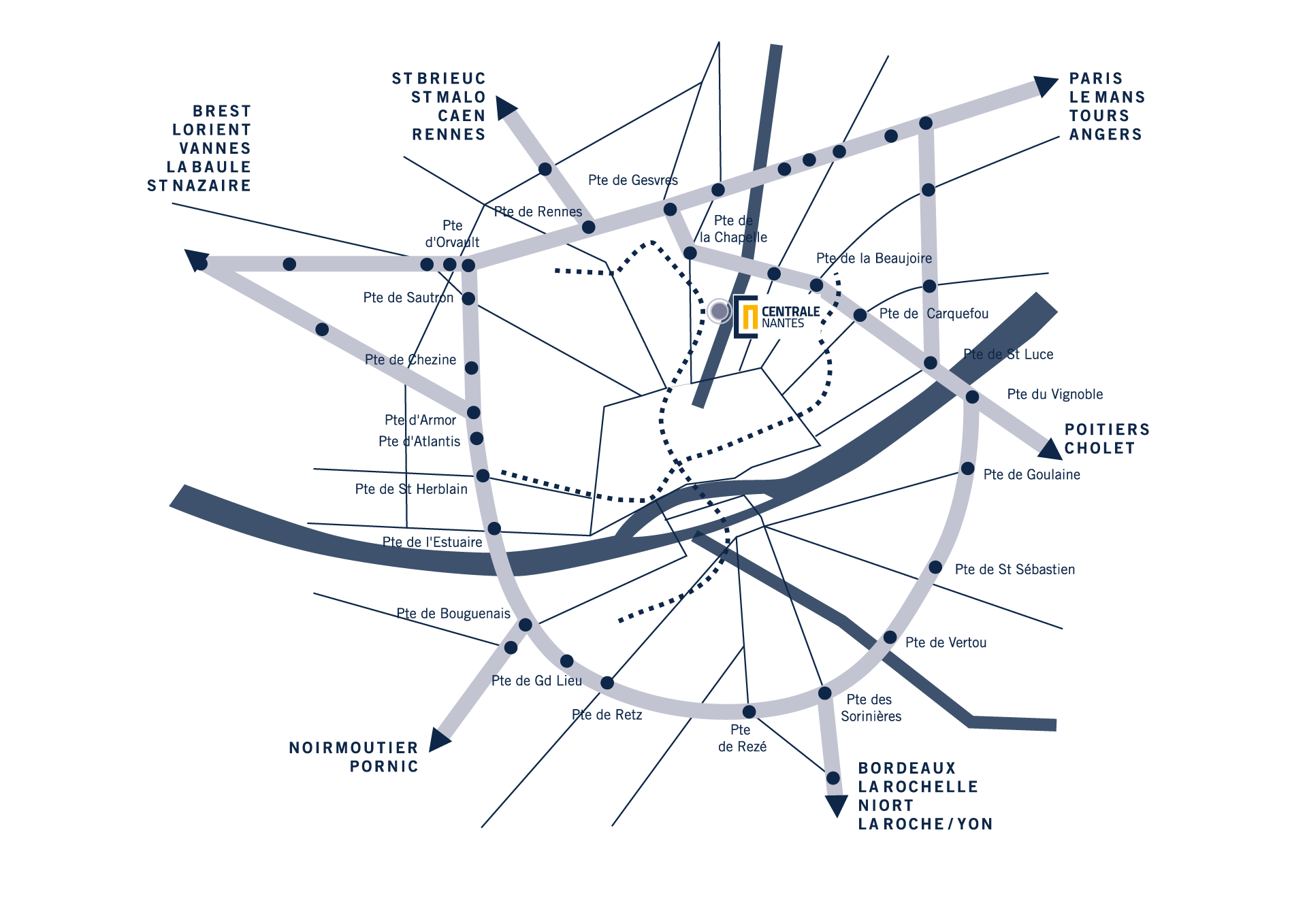 - Le bus 38 jusqu'à la station Pirmil - puis le tram ligne 2 (direction orvault grand val) jusqu'à l'arrêt Ecole Centrale - Audencia